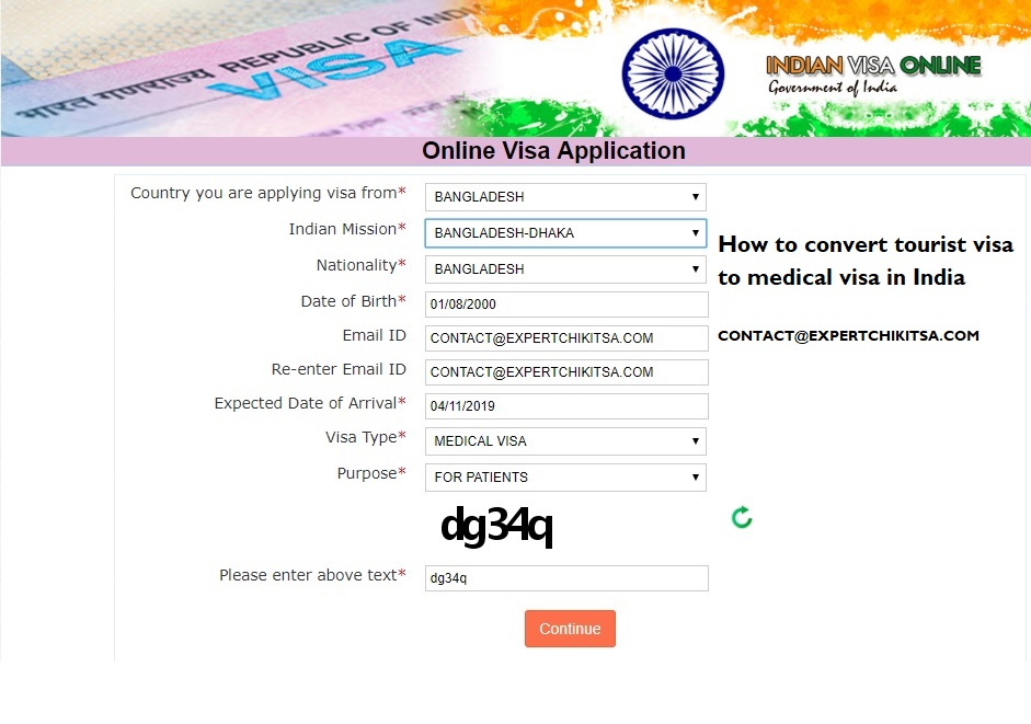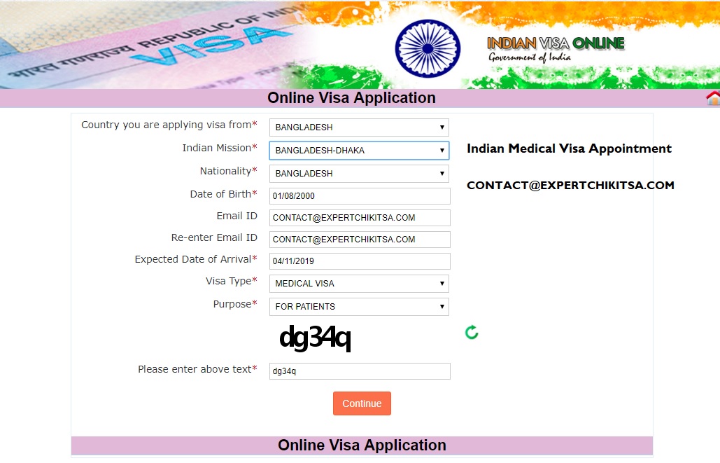 - Fill up the required information: your countryβs name, high commission, nationality, date of birth, nationality, e-mail id, expected date of arrival in India, visa type and Purpose. Enter the code and click Continue.
