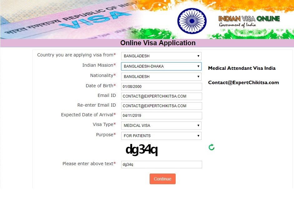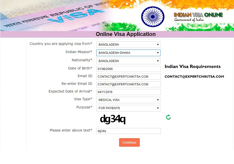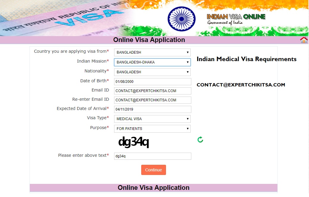- Fill up the required information: your countryβs name, high commission, nationality, date of birth, nationality, e-mail id, expected date of arrival in India, visa type and Purpose. Enter the code and click Continue.