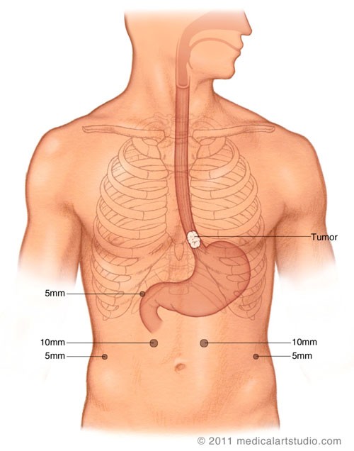 In esophagectomy (THE), the esophagus is removed without opening the chest. Instead, an incision is made between the bottom of the breastbone and the belly button. A further small incision is made on the left side of the neck. The surgeon removes the esophagus, pushes the stomach up to the region in the neck where the esophagus has been removed and attaches the remaining part of the stomach to the neck. Lymph nodes in the chest or neck can also be removed if they are cancerous.